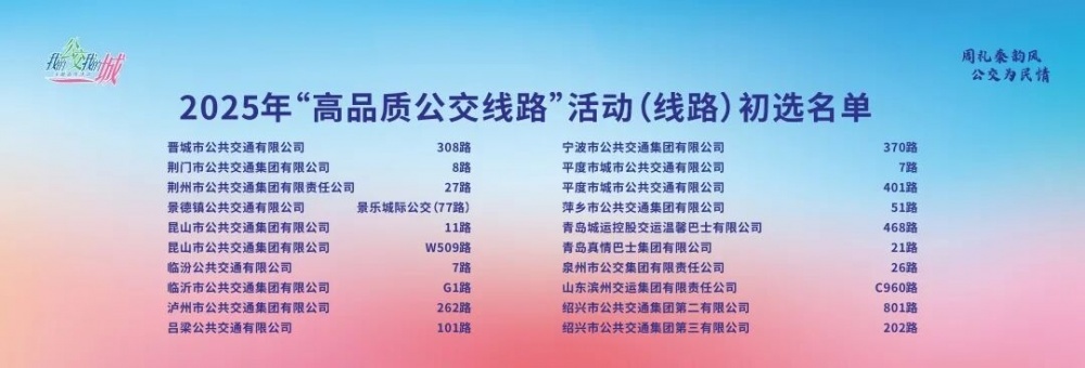 近日交通運輸部2025年“我的公交我的城”主題宣傳活動(寶雞站)相關(guān)初選名單公布8路巾幗示范線入選2025年“高品質(zhì)公交線路”活動初選名單。